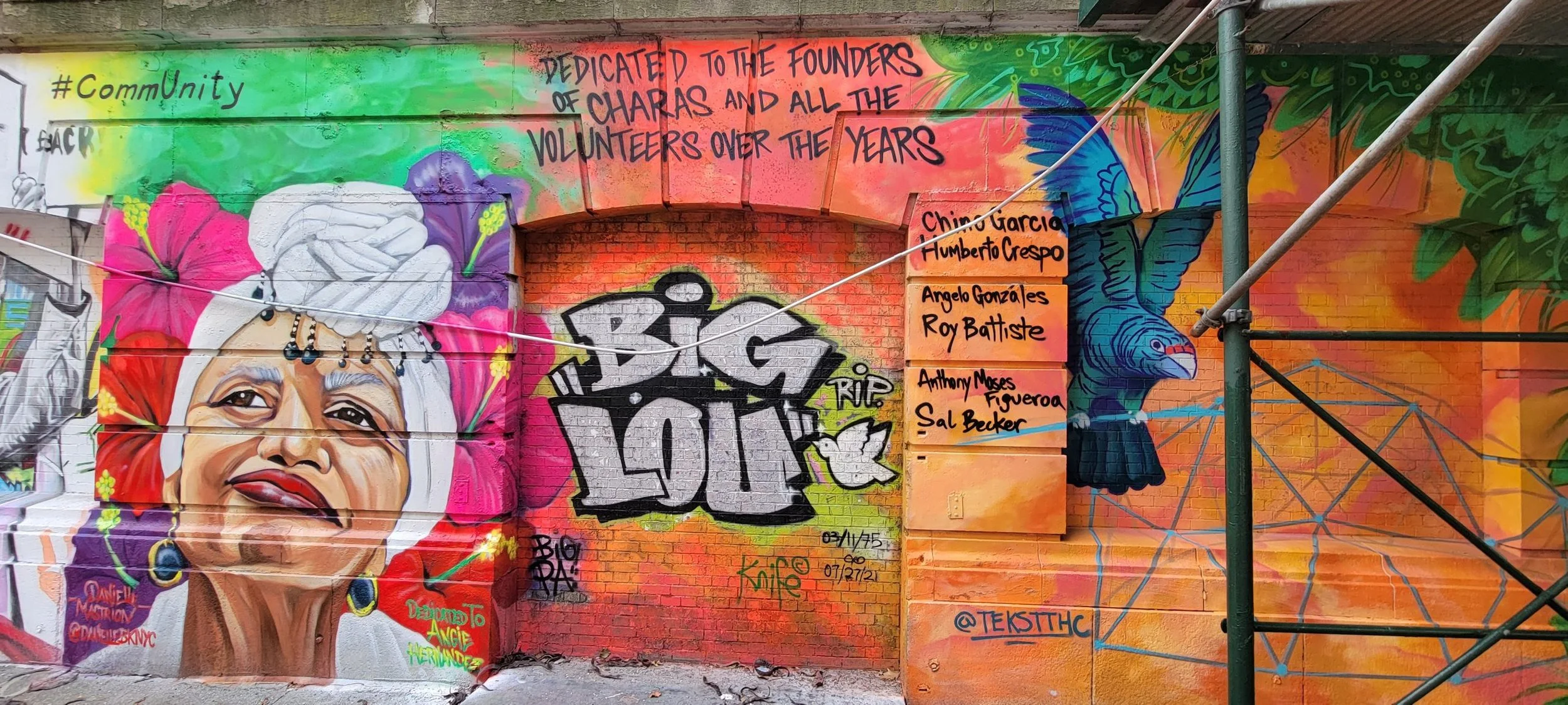 The following artists took part in this mural makeover project: Will Power, Al Diaz (Samo), Danielle Mastrion, Marissa Molina, Christian Penn, Michela Muserra, Nico Collazo, Jodi Dareal, Charlie Elo, and Cram Concepts. Together, they painted 9 murals that celebrate CHARAS’ legacy including portraits of founding members Chino Garcia, Angie Hernandez, and poet Bimbo Rivera, who coined the term “Loisiada”, and remind us of what has been lost in the community—and what needs to be restored.