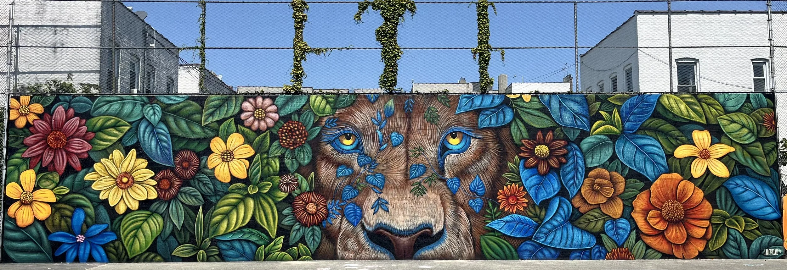 Projectivity was able to support Jenna Morello for this MASSIVE courtyard beautification at IS96 - Seth Low in Brooklyn. After a new mascot update, Jenna was tasked with painting this 1500 sq ft mural and bringing the Lion to life.