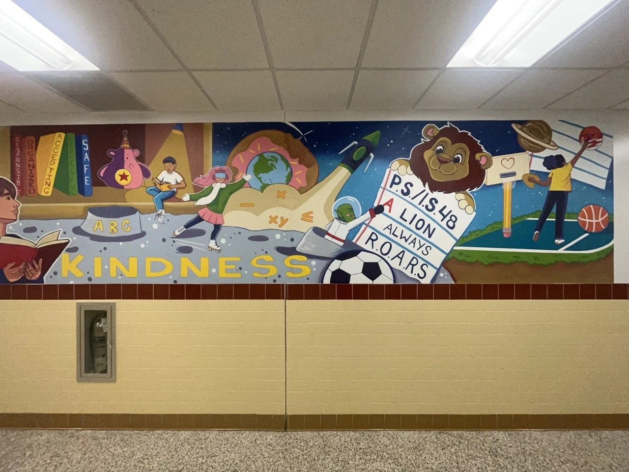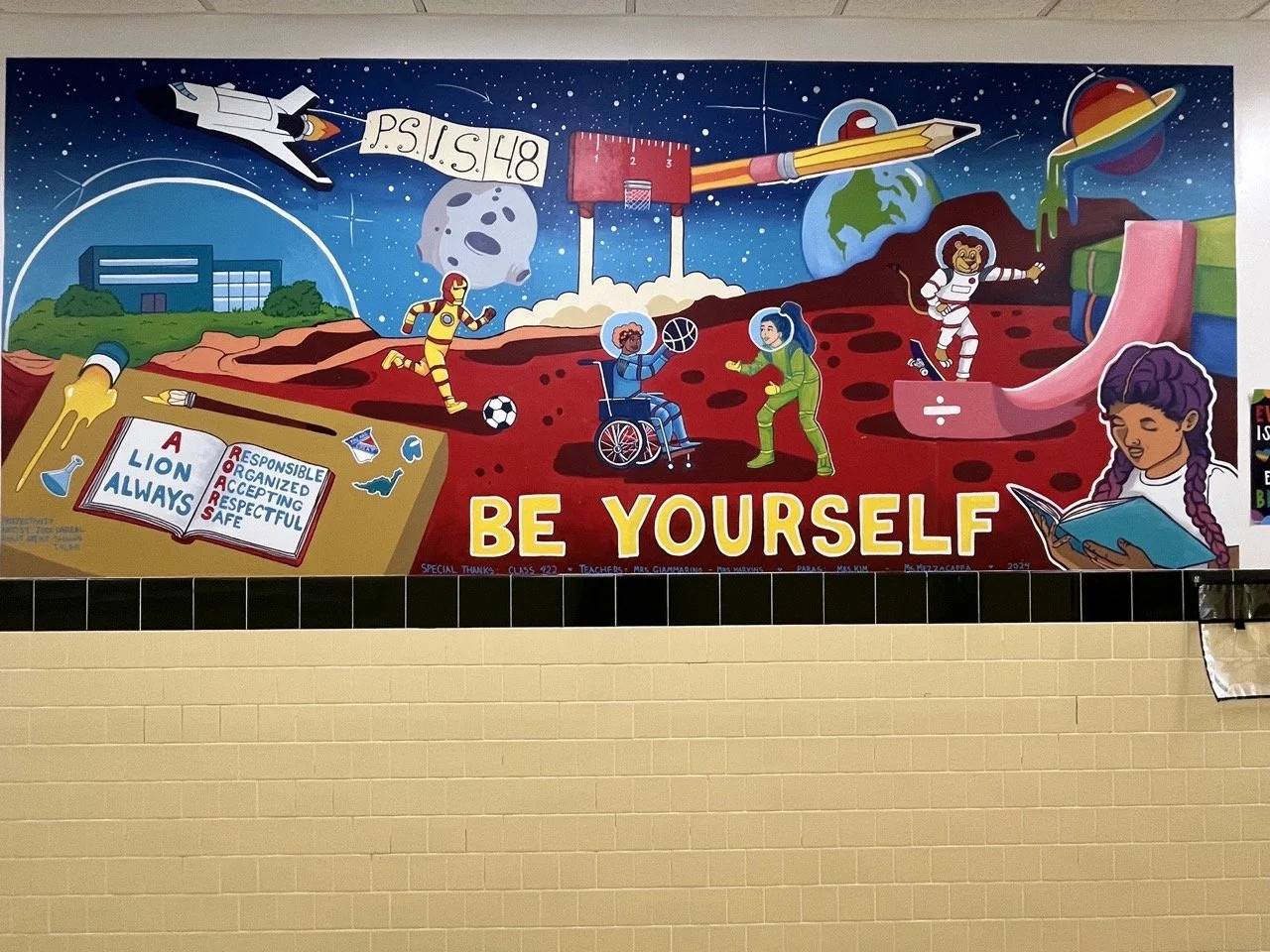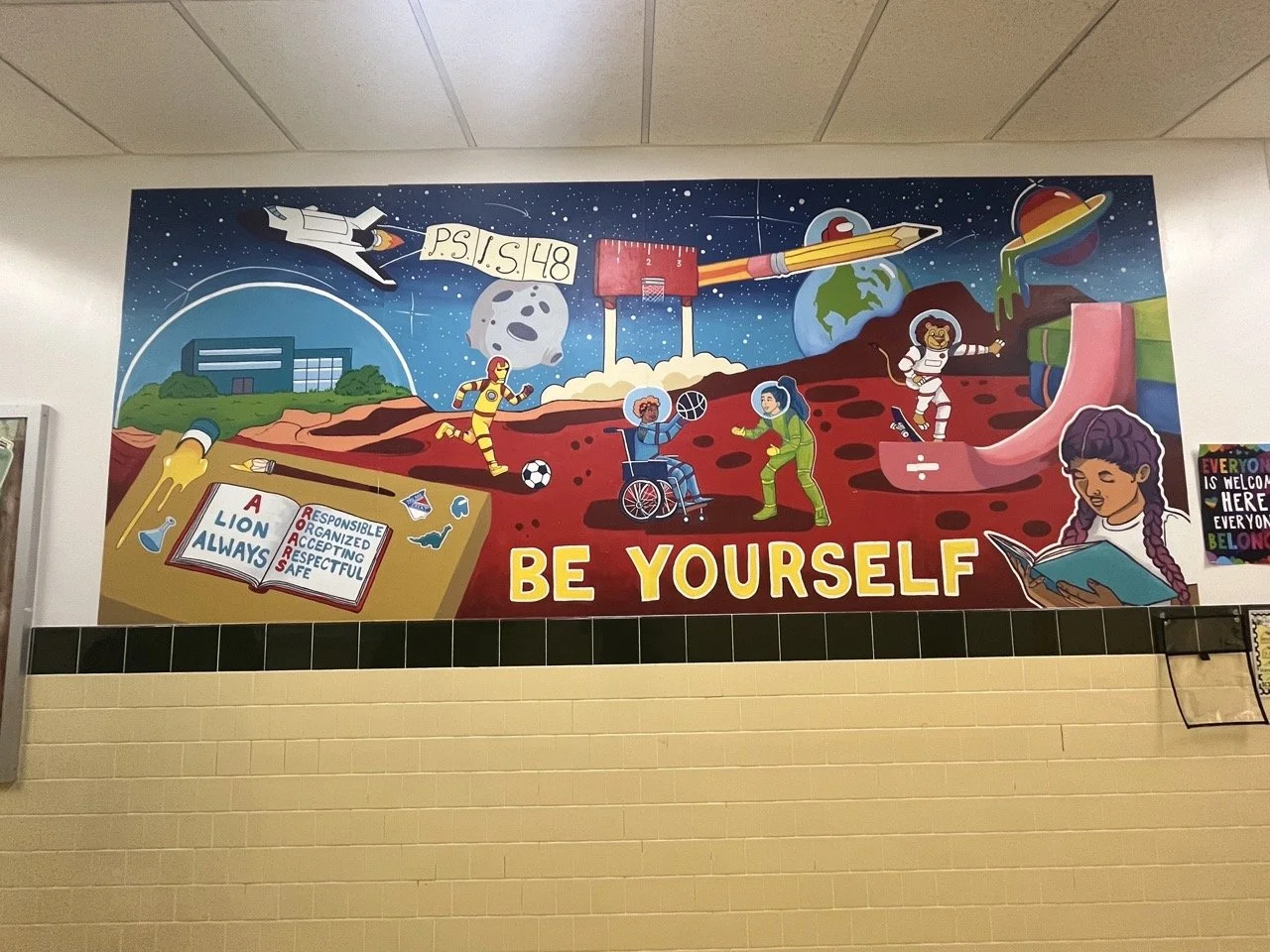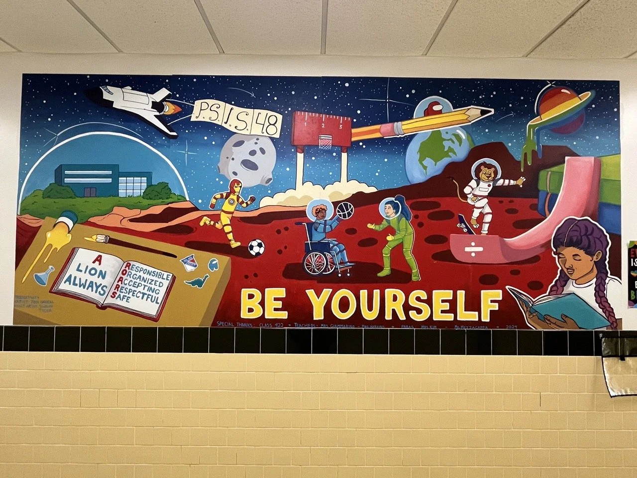 Art Director Jodi Dareal worked with 95 4th grade students at PS 48 in Staten Island to design this mural titled “Imagination”. Students helped paint this 20ft x 5ft mural on polytab and it was installed on the 4th floor across from the library.