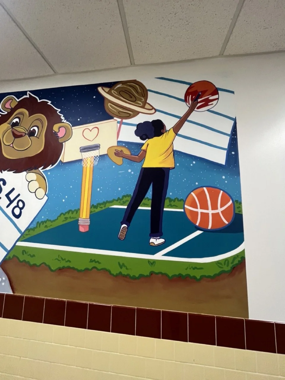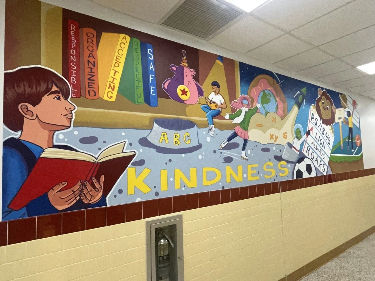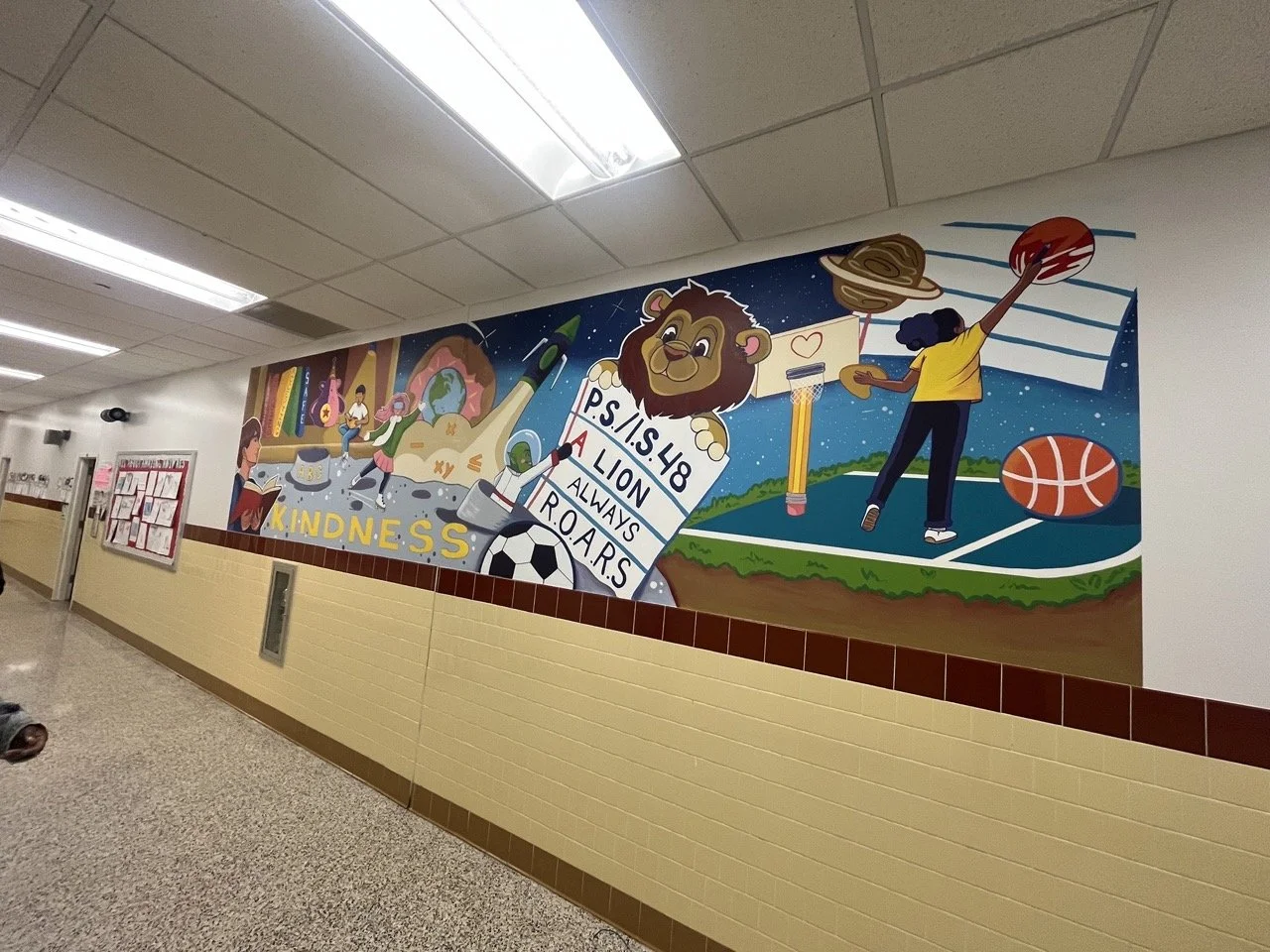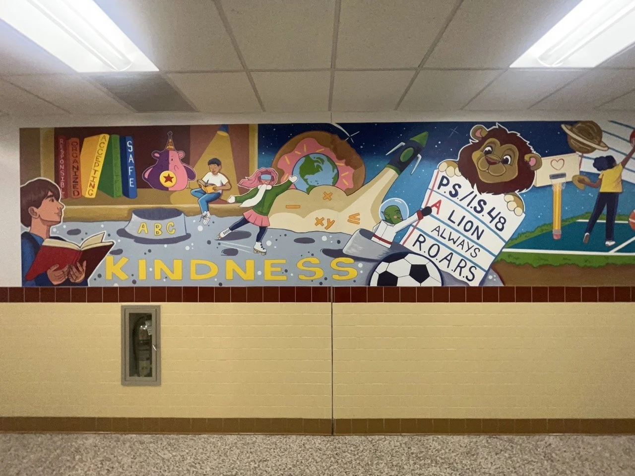 Art Director Jodi Dareal worked with 95 4th grade students at PS 48 in Staten Island to design this mural titled “Imagination”. Students helped paint this 20ft x 5ft mural on polytab and it was installed on the 4th floor across from the library.