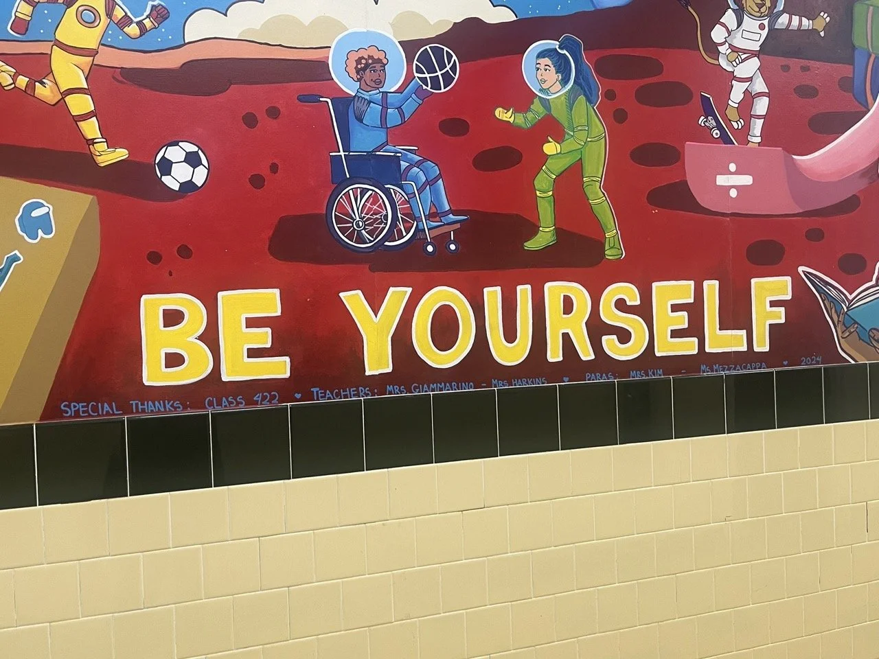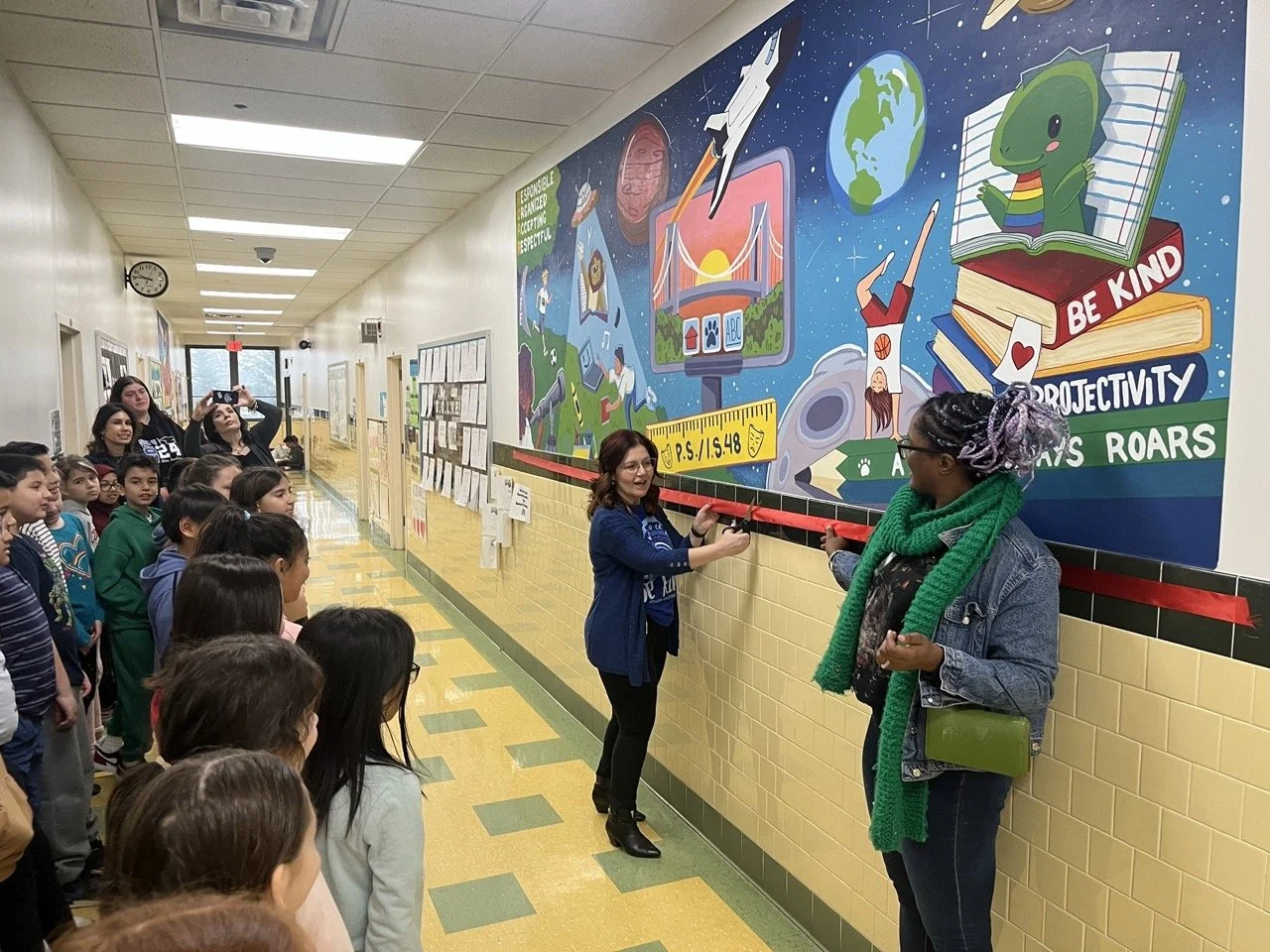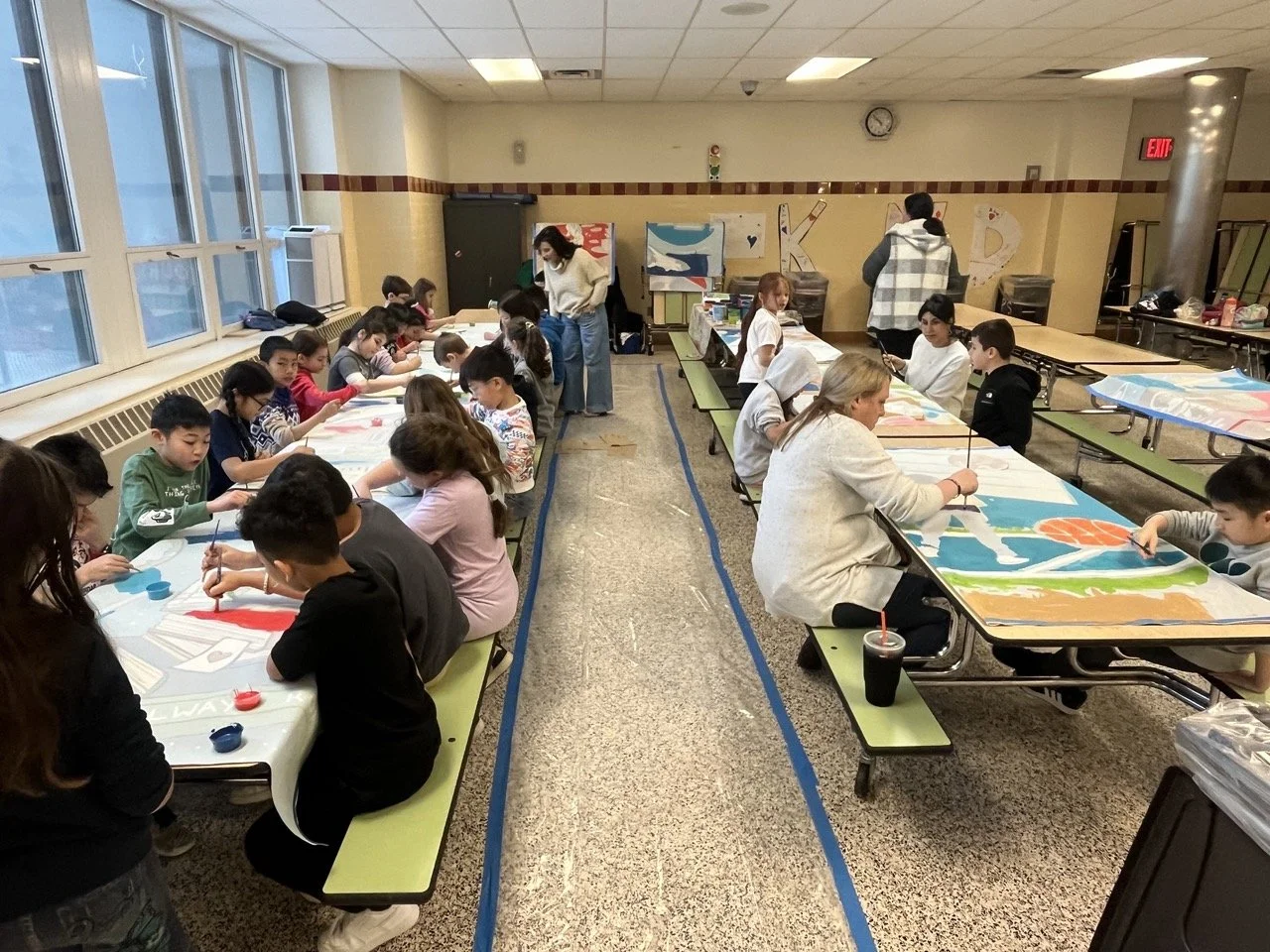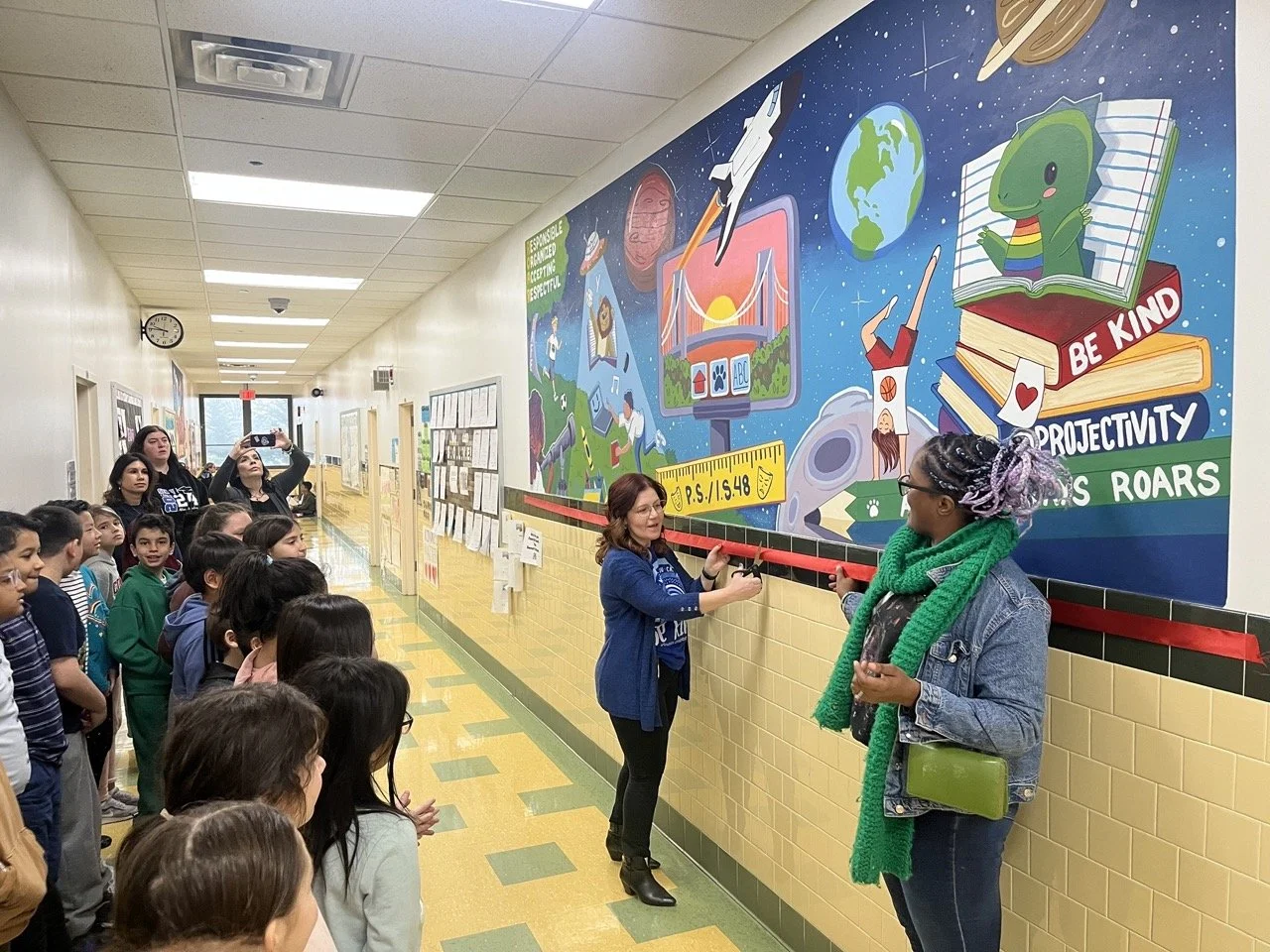 Art Director Jodi Dareal worked with 95 4th grade students at PS 48 in Staten Island to design this mural titled “Imagination”. Students helped paint this 20ft x 5ft mural on polytab and it was installed on the 4th floor across from the library.