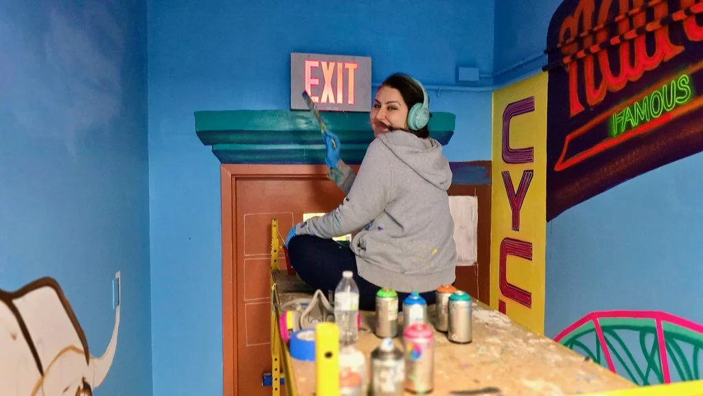 Imagines iconic artists from the 15th – 20th centuries as children with different examples of their art.  The mural goes in chronological order showing the different time periods of famous art.