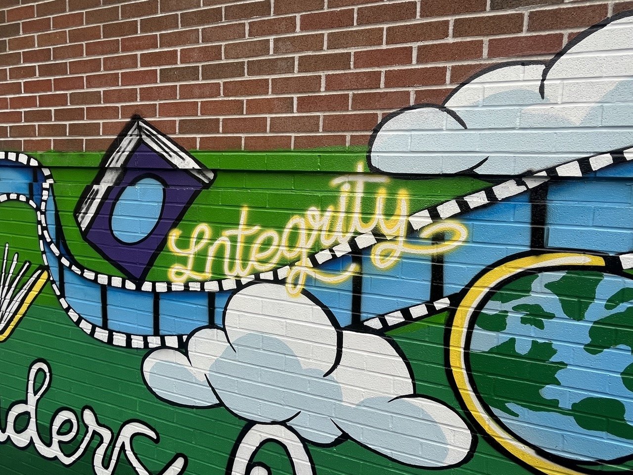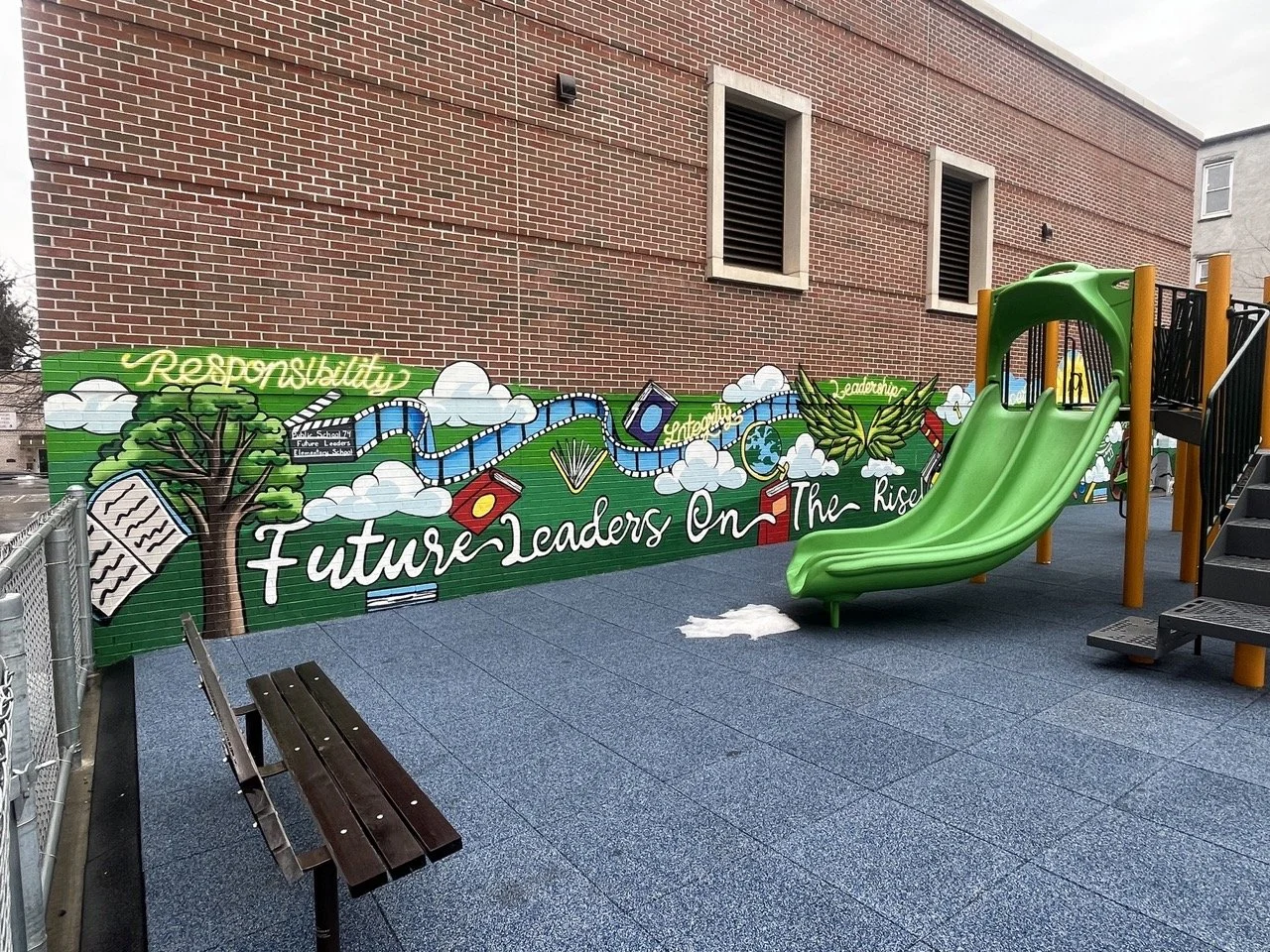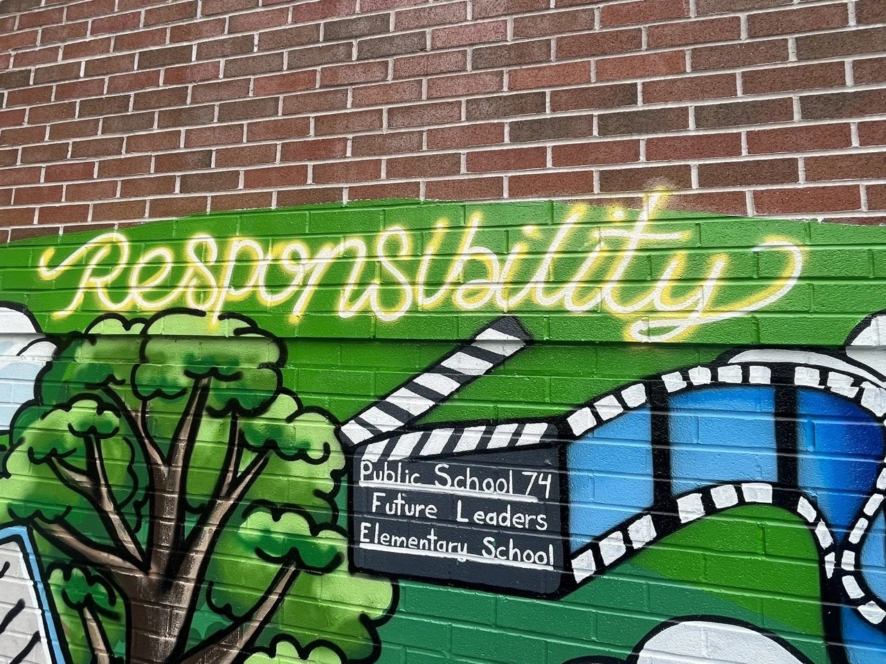 This 70ft x 6 ft mural was designed by Josue Mendez and the students at the PS74 Future Leaders School in Staten Island.