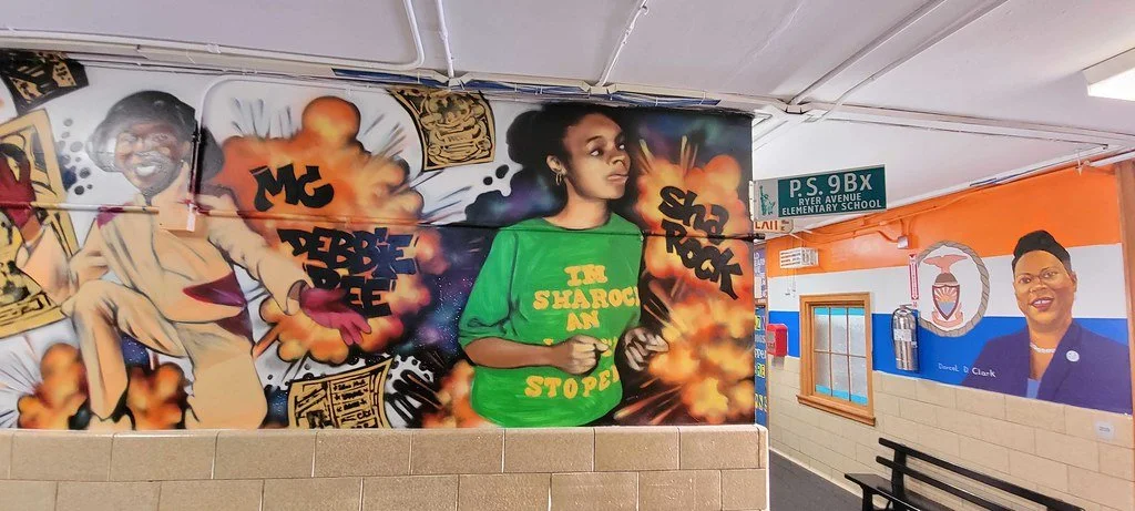 Artists Daze, André Trenier, and Marthalicia wanted to highlight notable Bronx natives and others who have made an impact in the borough. Daze created a portrait of Astrophysicist and planetary scientist Neil DeGrasse Tyson. With design and style input from the Principal and the student body, André Treneir was inspired by Bronx native and comic book writer Stan Lee, along with hip hop icons DJ Kool Herc, Debi Dee, and Sha Rock. His portrait of Stan Lee, set against a comic book background, tells the story of other cultural icons and hip hop pioneers from the borough. The final portrait serves as a memorial tribute to P.S. 9’s librarian Lucy Vigilant-Smith. Lucy Vigilant-Smith passed away in March 2022 and had a huge impact on the P.S. 9 community. She had an unwavering passion for improving her community through promoting literacy and sociocultural development and was the epitome of a servant leader. Lucy was devoted professionally and personally to making sure every child in her community had the opportunity to be successful in school and in life. She provided staff development for teachers, mentored students on social and emotional needs, hosted regular parent engagement and enrichment events using library resources, and sponsored programs such as health fairs, career days, and reading motivation programs. By including her with Stan Lee and others, André wanted the student body to recognize that they too are heroes. Marthalicea featured two civic icons born and raised in the borough, Supreme Court Justice Sonya Sotomayor and the borough’s first African American woman District Attorney Darcel Clark.